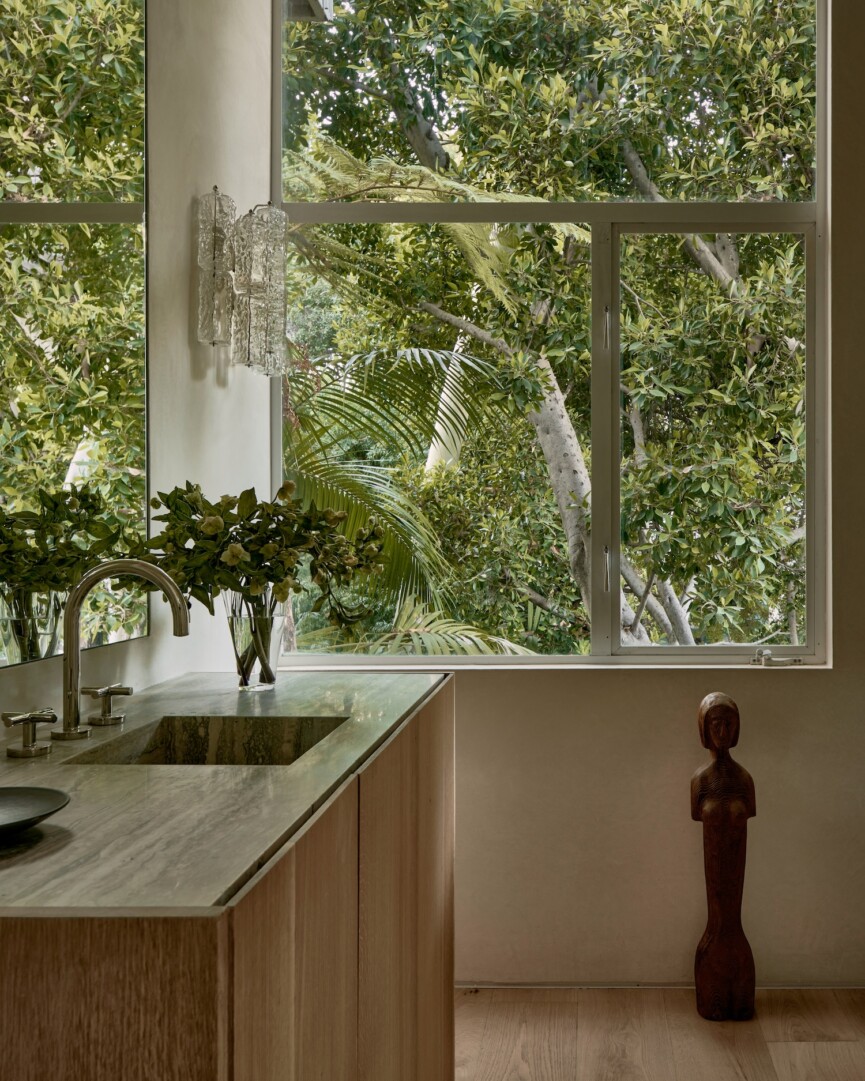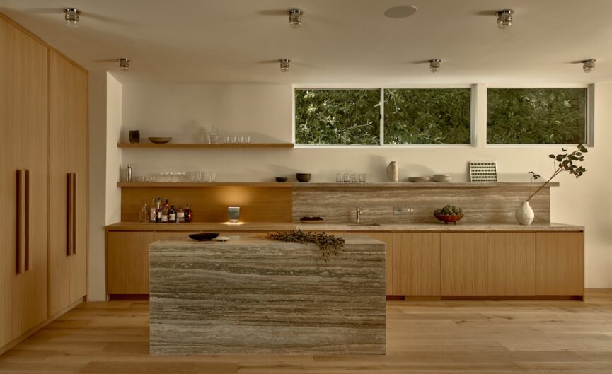 That philosophy guided the interiors. Ome Dezin worked within a neutral palette designed to recede, warming the space with natural woods and grounding it with stone—most notably travertine in the kitchen and bathrooms. These materials don’t compete for attention; they create calm. “Nature was not treated as decoration,” Claire says. “It was treated as a collaborator.” The result is a home that feels deeply attuned to its setting, where interiors act as a backdrop to what’s unfolding just beyond the glass.