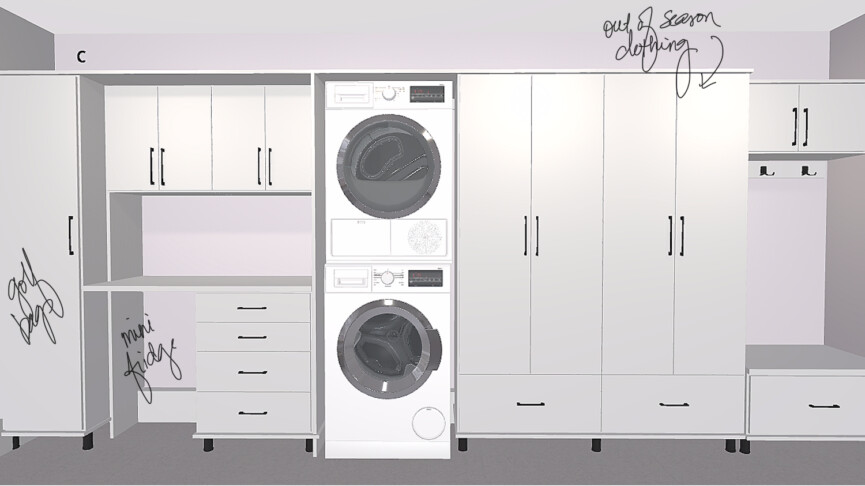 Since I’m usually folding everything in the laundry room, I needed enough countertop and hanging space to make it highly efficient. The stacked washer and dryer will be recessed so they sit flush with the countertop (we actually pushed the wall back slightly to make this happen). A small detail, but visually so impactful.