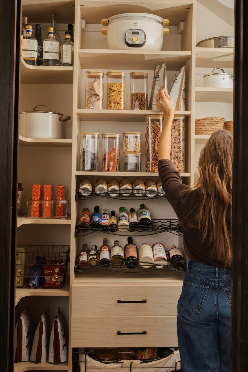 I group items loosely by category, then focus on visibility: clear containers, open baskets, and storage ystems that work at a glance. Trust me: I’m not decanting everything. This is more about creating a pantry that reflects how I actually cook (and snack!) day to day.