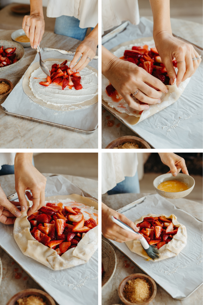 - Mound the strawberries and their juices in the middle of the dough and leave a 2-inch border. Fold the border over the fruit, pleating as you fold and leaving the center of the galette exposed. Brush the crust with the egg wash.