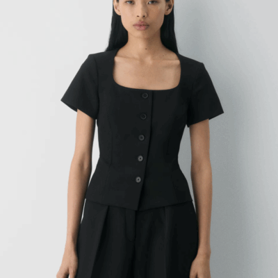 - Tailored top: Structured and versatile—perfect with denim, sequins, or silk.