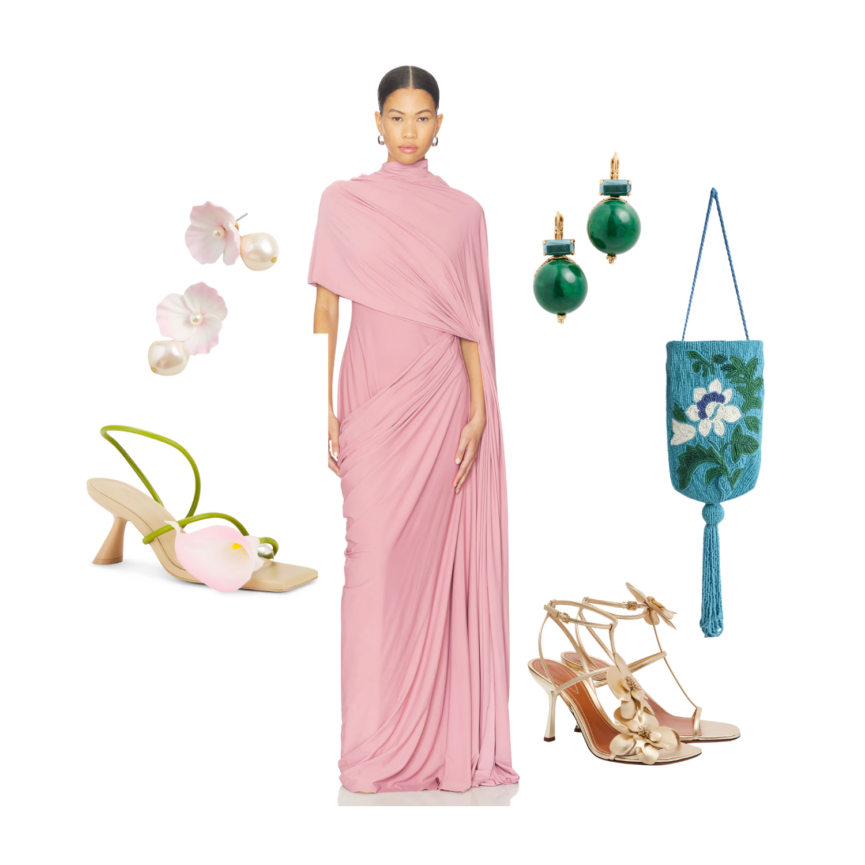 With spring comes a wave of weddings, showers, and outdoor celebrations—and with them, the inevitable question of what formal dresses to wear this spring. A simple formula makes it easy: a spring-toned dress paired with floral or textured accessories. While floral dresses are always eye-catching, solids tend to be more versatile and easier to rewear. Think of the dress as your foundation, then bring in seasonal details through your shoes, bag, or jewelry. The result feels thoughtful, elevated, and easily restyled (as shown above) for multiple occasions.